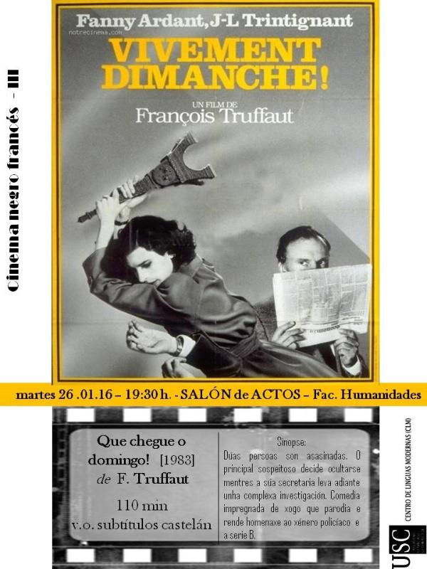 A proxección do filme ‘Vivement dimanche’ cerra este martes a terceira edición do ciclo de cinema negro francés no salón de actos da Facultade de Humanidades do campus de Lugo, onde se poderá visualizar a última creación de François Truffaut, que conta nos seus papeis principais con Fanny Ardant e Louis Trintignan.