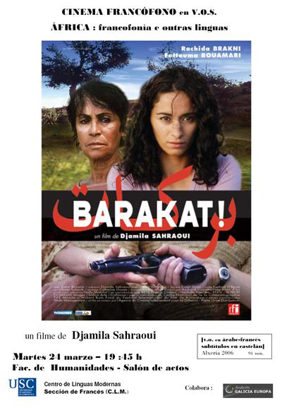 O filme ‘Barakat’(basta!) (Djiamila Sahraoui, Alxeria, 2006, 94 min) proxéctase este martes 24 de marzo, ás 19:45 horas, dentro do ciclo de cinema francófono África, francofonía e outras linguas, organizado pola sección de francés do Centro de Linguas Modernas (CLM) e que se está a desenvolver ao longo de todo o mes no salón de actos da Facultade de Humanidades do Campus de Lugo.