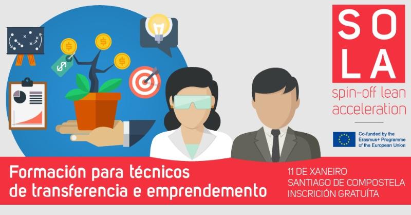 A USC acollerá o vindeiro 11 de xaneiro unha xornada gratuíta de formación dirixida a técnicos de oficinas de transferencia e emprendemento, co obxectivo de mellorar as súas capacidades á hora de apoiar a creación e o crecemento de empresas de base tecnolóxica. A xornada celebrarase durante o evento de peche do proxecto internacional SOLA (Spin-Off Lean Acceleration), co-financiado polo programa Erasmus+ da Unión Europea. Impartiranse de forma simultánea os catro módulos do itinerario formativo deseñado no marco de SOLA: ‘Finanzas para emprendedores universitarios’; ‘Lean Canvas e redefinición estratéxica’; ‘Propiedade industrial e intelectual’ e ‘Internacionalización de empresas universitarias’.