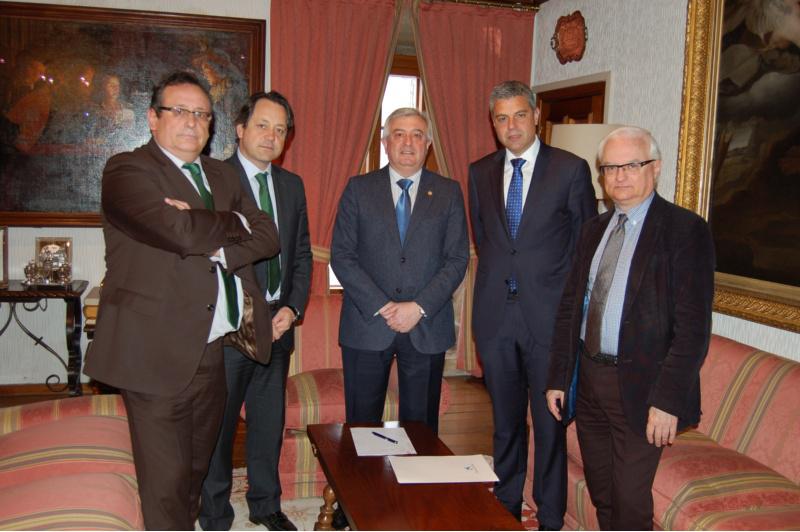 No centro, Juan Viaño e Marc Arthur Benhamou, acompañados do xerente da USC e directivos de la Caixa.