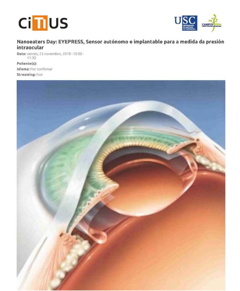 No transcurso dunha xornada no Centro Singular de Investigación en Tecnoloxías da Información (CiTIUS), o próximo venres 23 celebrarase unha xornada do proxecto Nanoeaters na que se presentará Eyepress, un sensor autónomo e implantable para a medida da presión intraocular que está sendo desenvolvido por investigadores do CiTIUS e do Laboratorio Ibérico Internacional de Nanotecnoloxía (INL). Na presentación, ademais do persoal investigador intervirán representantes da Axencia Galega de Innovación (GAIN).