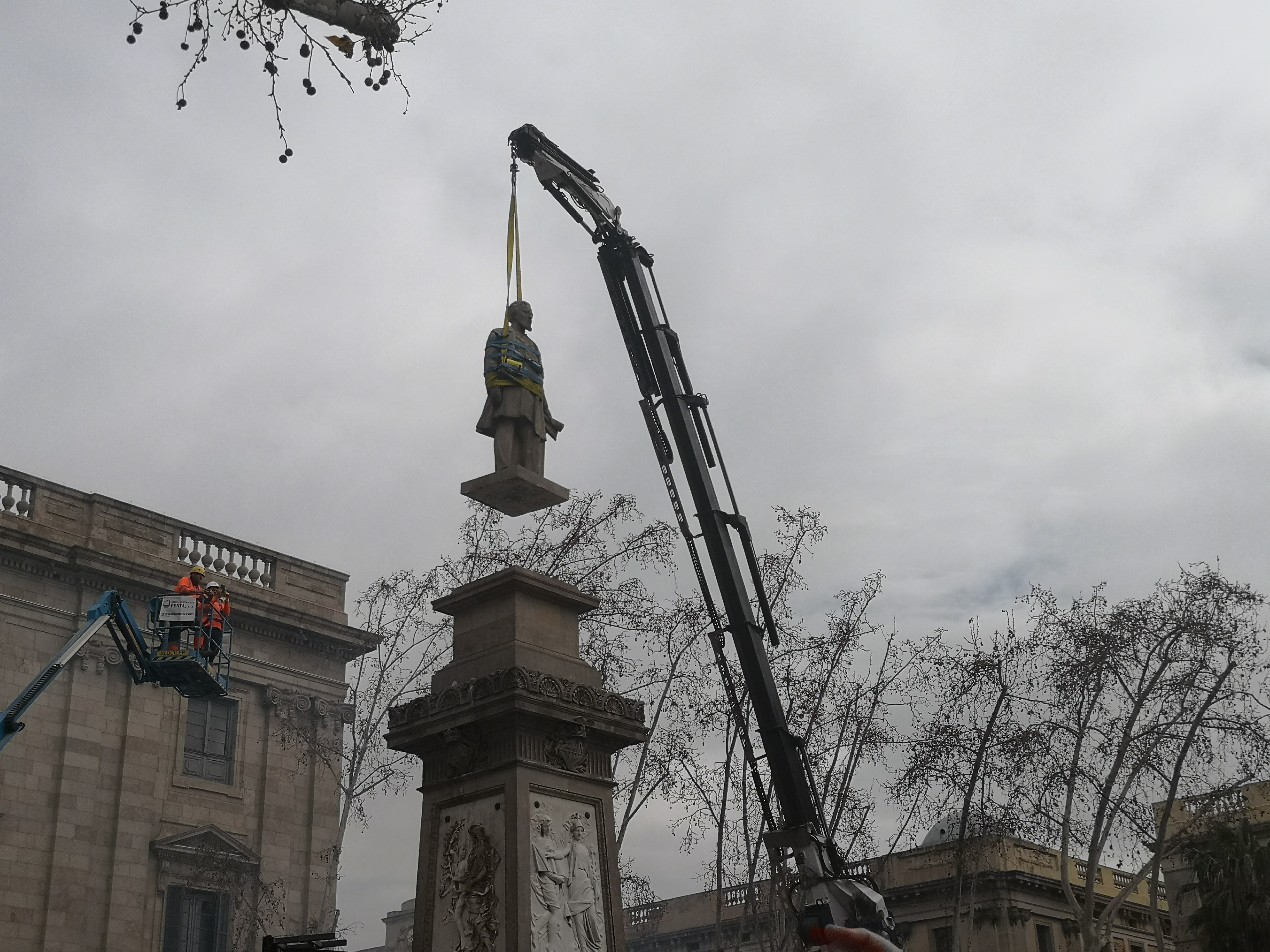 Instantánea da retirada do monumento a Antonio López y López que se vai tratar no obradoiro