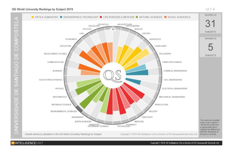 Logo da avaliación da produción científica procedente de 3.551 universidades de todo o mundo, o QS World University Ranking acaba de facer público unha nova edición da clasificación que avalía institucións universitarias por áreas de coñecemento. A USC figura destacada no plano internacional en cinco destas áreas e entre as dez primeiras de España noutras doce categorías. Os mellores resultados da institución académica compostelá rexístranse en Linguas Modernas, onde a produción científica ascende ao rango 201-250 de entre as universidades de todo o mundo avaliadas; en Lingua e Literatura Inglesa (251-300), e en Ciencias Medioambientais (251-300). A USC tamén destaca en Medicina, na posición 301-350, e en Matemáticas, igualmente no intervalo 301-350. Tomando como referencia ás outras universidades españolas, a USC sitúase entre as dez mellores universidades españolas en Odontoloxía e en Lingüística (6º posto); en Farmacia e Farmacoloxía, en Ciencias Veterinarias e en Socioloxía, ámbitos nos que se sitúa como a sétima mellor de España; en Educación (8º); Política e Estudos Internacionais (9º); e en Historia, Enxeñaría Química, Ciencias Biolóxicas, Física e Astronomía e en Estudos de Comunicación e Medios (10º). Para a elaboración desta clasificación, os seus responsables tomaron en consideración a opinión experta de 85.602 académicos e 41.910 empresarios, así como a análise de 17,3 millóns de artigos e máis de 100 millóns de citas publicadas e medidas a través das bases de datos de Scopus. QS Ranking Esta nova clasificación complementa á da edición 2014 do QS World University Ranking, que situaba a Universidade de Santiago entre as dezaoito institucións españolas, xunto coa Escola de Negocios ESADE, incluídas entre as 800 máis importantes do mundo segundo. Esta clasificación presta atención a catro áreas como son, investigación, ensino, empregabilidade e proxección internacional. No apartado das institucións españolas figuran, ademais da USC, as universidades de Barcelona, Autónoma de Barcelona, Autónoma de Madrid, Complutense, Navarra, Pompeu Fabra, Politécnica de Cataluña, Carlos III, Politécnica de Madrid, Politécnica de Valencia, Granada, Salamanca, Sevilla, Valencia, Zaragoza, Alcalá, Murcia e a ESADE.