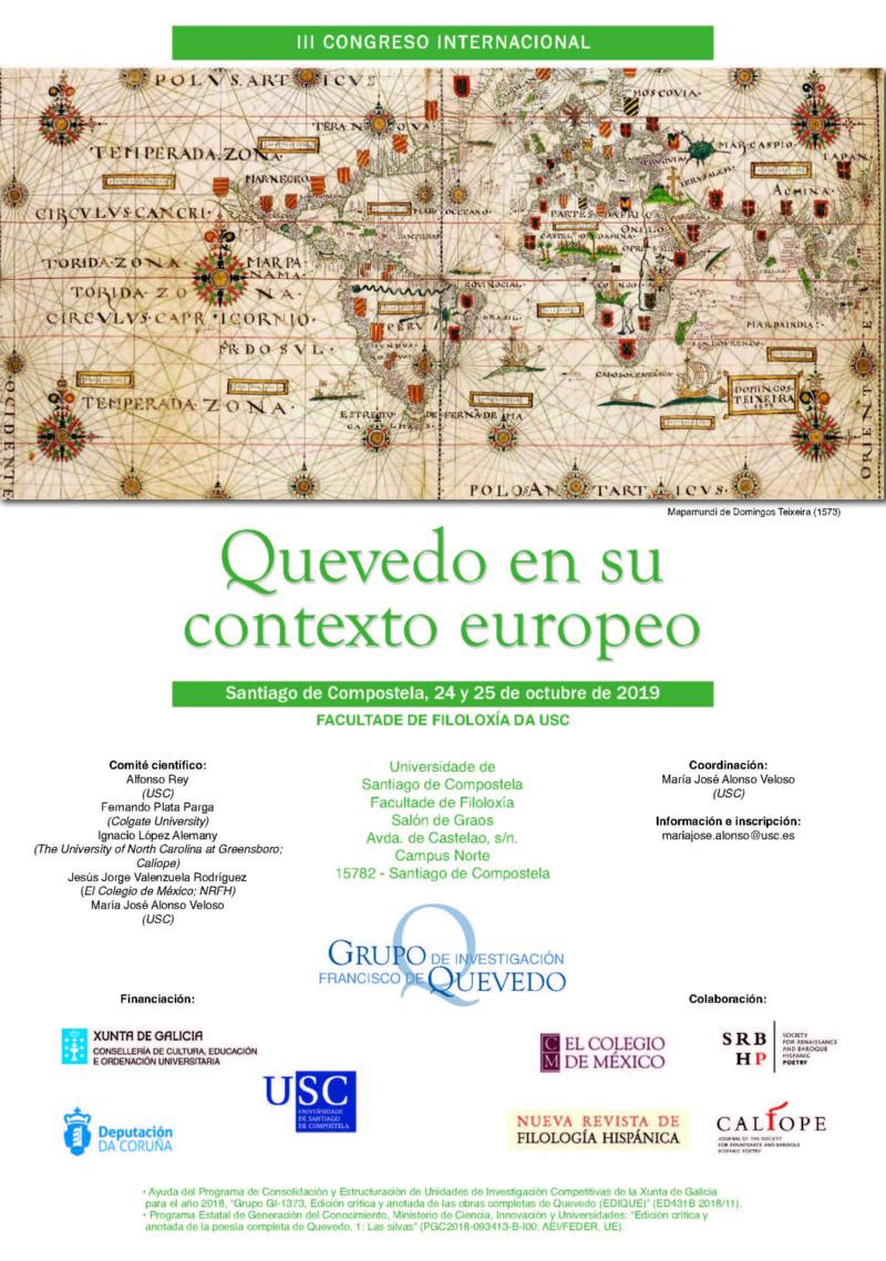 O III Congreso internacional que aborda a figura de Francisco de Quevedo dentro do seu contexto europeo celébrase os días 24 e 25 de outubro na Facultade de Filoloxía da USC, baixo a dirección da profesora María José Alonso Veloso e impulsado polo grupo de investigación Francisco de Quevedo.