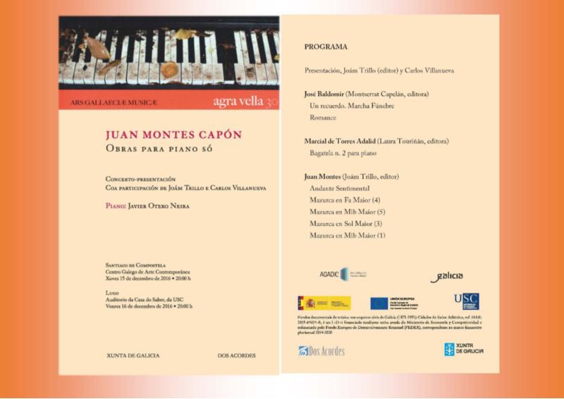 A Consellaría de Cultura e Educación e a editorial Dos Acordes presentaron este mércores en rolda de prensa o primeiro volume das Obras para piano do histórico compositor lugués Juan Montes Capón (1840-1899), considerado un dos máximos expoñentes do rexurdir musical galego. Trátase dunha edición crítica a cargo de Joám Trillo que inclúe un estudo introdutorio realizado polo profesor da USC Carlos Villanueva.