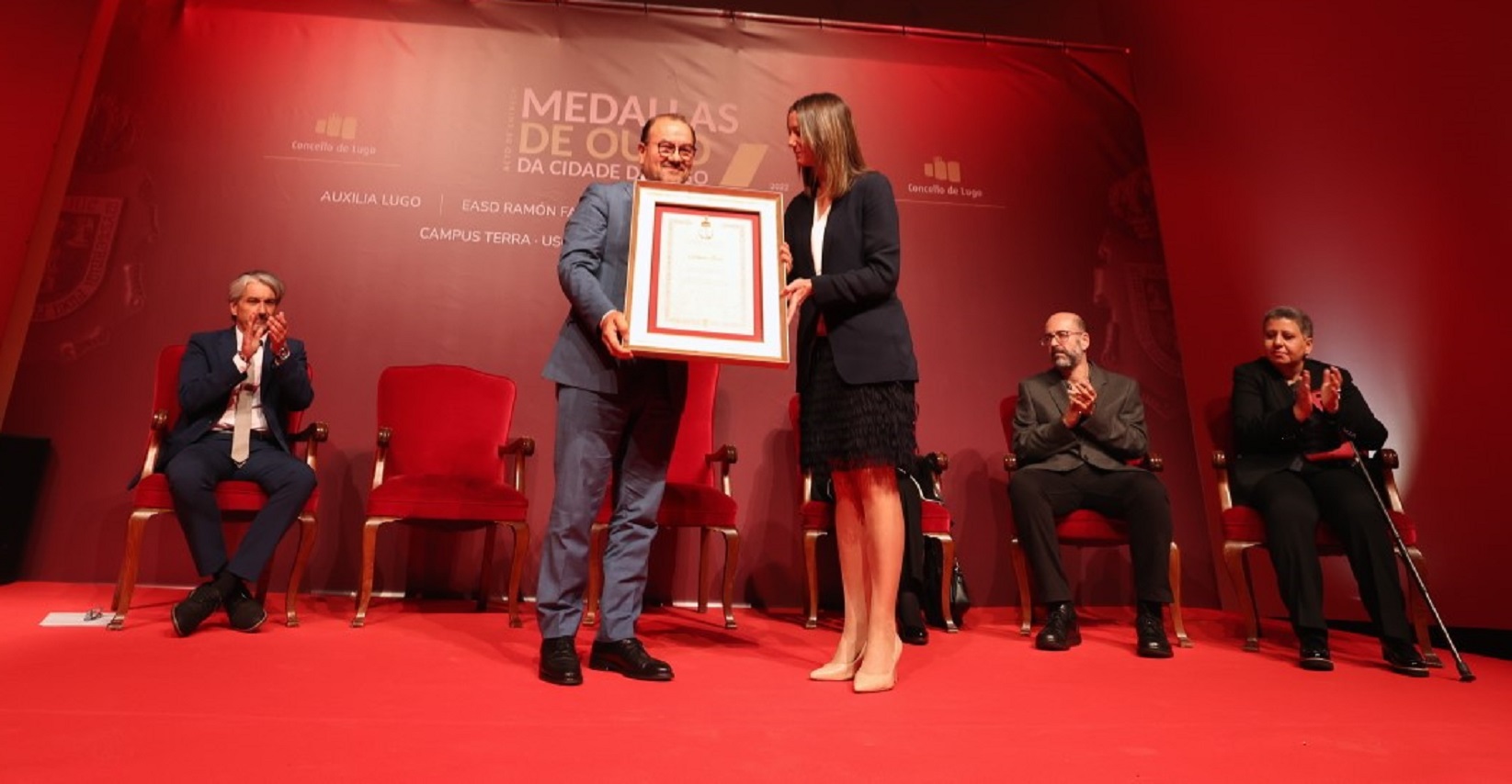 A cerimonia de entrega das Medallas de Ouro da Cidade de Lugo 2022, un recoñecemento que tamén recibiron este ano entidades como Auxilia, a Escola de Arte e Superior de Deseño Ramón Falcón, a Sociedade Filarmónica de Lugo e, a título póstumo, o escritor Darío Xohán Cabana, congregou no Museo Interactivo da Historia de Lugo (MIHL) unha nutrida representación da USC.