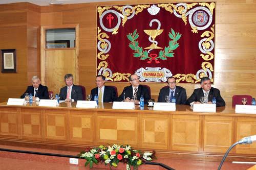 O reitor da USC, Senén Barro, impúxolle este venres 6 a Insignia de Ouro da institución académica ao profesor emérito Manuel Sanmartín Durán, no transcurso dun acto homenaxe celebrado na Aula Magna da Facultade de Farmacia. Xunto ao homenaxeado compartiron mesa, ademais do reitor, o vicerreitor de Comunidade Universitaria, José M. Mayán Santos; o presidente do Consello Social da USC, Manuel Puga Pereira; o secretario xeral de Universidades, José Alberto Díez de Castro; o decano de Farmacia, Juan José Torres Labandeira; e o profesor Florencio Martínez, encargado de dar lectura a á laudatio do homenaxeado.