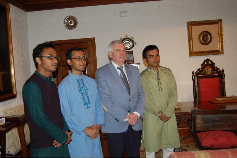 O reitor Juan Viaño recibiu os tres estudantes da Universidade de Daca que estudan español na USC cunha bolsa da Cátedra Inditex