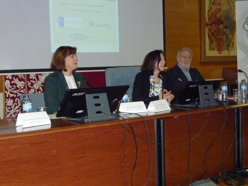 A Facultade de Relacións Laborais de Santiago e o Grupo Colmeiro organizan este luns unha xornada conmemorativa do Día da Muller Traballadora analizando de xeito multidisciplinar a situación da muller no eido laboral. Na sesión inaugural interviñeron a secretaria xeral de Igualdade, Susana López Abella, a decana da Facultade, Silvia Moscoso, e o coordinador do Grupo Colmeiro, Luis Caramés, que deron paso á presentación do Barómetro Galego de Equidade Laboral (EquiGal) da man do propio profesor Caramés, e da directora deste proxecto María Bastida.