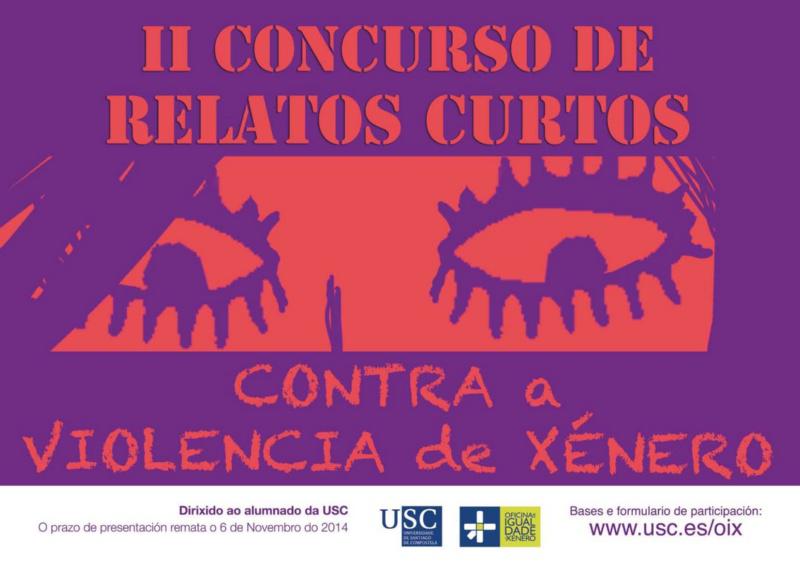 Un ano máis a Universidade de Santiago convoca, con motivo do Día Internacional para a Eliminación da Violencia contra as Mulleres o 25 de novembro, o Concurso de Relatos Curtos contra a Violencia de Xénero. A esta iniciativa que desenvolve a Oficina de Igualdade de Xénero pode presentarse o alumnado matriculado na USC este curso, que dispón de prazo ata o vindeiro 6 de novembro para presentar as súas obras. Os textos inéditos estarán redactados en galego, cunha extensión máxima de 1.000 palabras incluído o título e unha temática relacionada coa violencia contra as mulleres. As persoas participantes optarán a un primeiro premio de 250 euros e dous accésit de 150. O proceso do concurso poderá seguirse a través da web da Oficina de Igualdade de Xénero onde se publicarán a listaxe de participantes, composición do xurado, persoas que resulten gañadoras, así como a forma de entrega de premios. O xurado integrarano persoas con experiencia en temas relacionados coa violencia contra as mulleres e a igualdade de xénero.