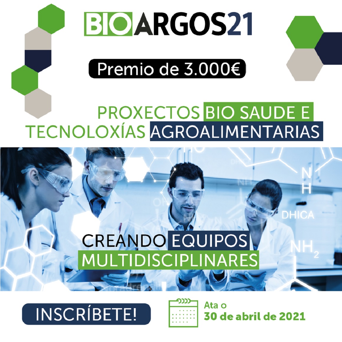 Baixo o lema ‘Detrás dun gran proxecto, hai un gran equipo’  o programa de emprendemento BioArgos21 comeza a súa oitava edición, co obxectivo de sensibilizar e adestrar a alumnado e persoal investigador no proceso de creación de empresas e promover o traballo en equipo. Esta iniciativa que busca persoas multidisciplinares, dispostas a traballar sobre proxectos innovadores no campo da Bio-Saúde e Tecnoloxías Agroalimentarias, amplíou o seu prazo de inscrición ata o 30 de abril, tal e como indican as bases convocatoria dispoñibles nesta ligazón.