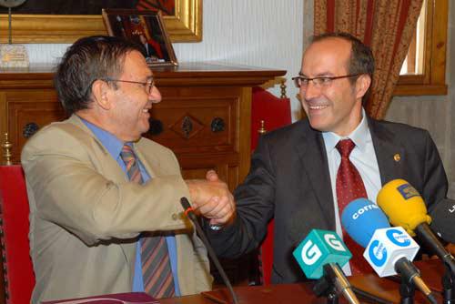 O reitor da Universidade de Santiago, Senén Barro, e o xefe comercial da Área de Negocio Norte da Dirección Xeral de Servizos de Alta Velocidade- Longa Distancia de Renfe, José Manuel Gómez, renovaron hoxe en San Xerome o acordo polo que a USC colabora coa operadora ferroviaria na promoción entre toda a comunidade universitaria do servizo Inter Rail.