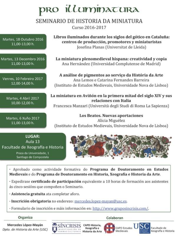A primeira cita será este martes 18 ás 11.00 horas na Aula 13 da Facultade de Xeografía e Historia cunha conferencia da profesora da Universidade de Lleida Josefina Planas sobre os libros iluminados durante os séculos do gótico en Cataluña.