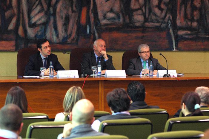 O reitor Juan Casares presidiu a inauguración dunha xornada de debate sobre ‘O reto estratéxico da internacionalización’ que, promovida polo Máster en Dirección e Xestión de Comercio Exterior, desenvolveuse na Facultade de Ciencias Económicas Empresariais e e na que participaron un nutrido grupo de estudantes, profesionais e expertos do Clúster Alimentario de Galicia. Xunto ao reitor participaron no acto de inauguración, o director do IGAPE, Javier Aguilera e o presidente do Clúster Alimentario de Galicia, José Luis Antuña. Na xornada participan empresas do sector alimentario como Feiraco, Coren, Estrella Galicia, Bodegas Martín Códax ou Pescanova, entre outros, así como as tres universidades galegas. O tema da formación é precisamente un dos máis aludidos nos debates, porque –como dixo o reitor de Santiago- “ en Galicia temos capacidade para producir e capacidade para innovar, a través do coñecemento”.