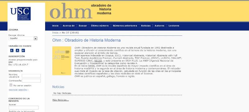 A revista OHM. Obradoiro de Historia Moderna vén de superar a sexta convocatoria de avaliación da calidade editorial e científica das revistas científicas españolas da Fundación Española para a Ciencia e a Tecnoloxía (FECYT), polo que recibe o selo de calidade que a distingue como excelente.