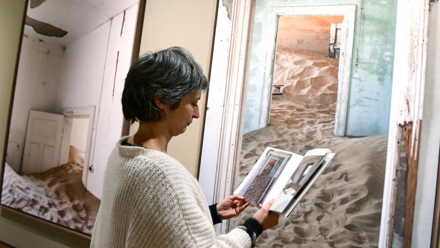 Dúas cidades abandonadas, Kolmanskop e Al Madam, son os lugares que nos mostran as fotografías da exposición 'A memoria do deserto', de Saleta Rosón, que se inaugurou no Salón Artesoado do Colexio de Fonseca este venres 2 de febreiro coa asistencia da vicerreitora de Estudantes e Cultura, Pilar Murias Fernández; da artista e do comisario da mostra, Antonio Cervera. Kolmanskop foi unha cidade colonial construída por empresas alemás en 1908 no deserto do Namib (Namibia) para aloxar os traballadores das minas de diamantes e Al Madam foi unha urbe levantada entre os anos 1970 e 1980 no interior do Emirato de Sharjah (Emiratos Árabes Unidos), a só 60 quilómetros da cidade de Dubai.