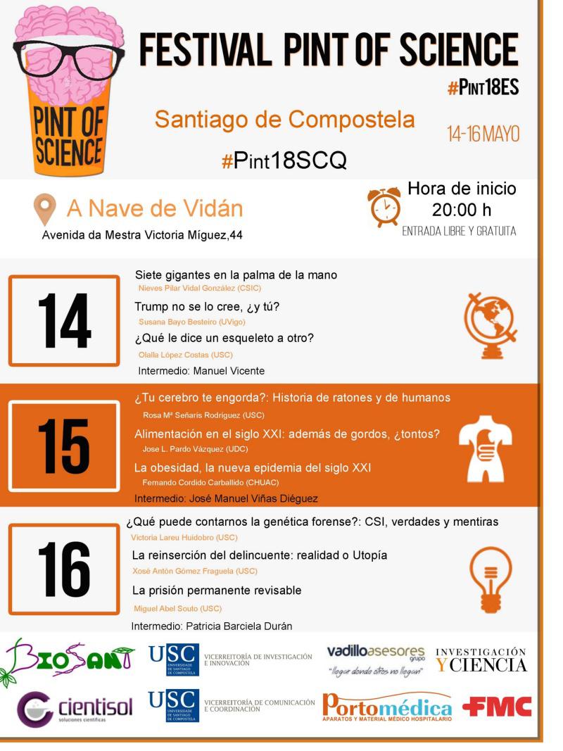 O Pint of Science en Santiago comeza este luns coas intervencións 'Sete xigantes na palma da man' de Nieves Pilar Vidal González (CSIC); 'Trump non o cre, e ti?' de Susana Bayo Besteiro (UVigo); e ¿Que lle di un esqueleto a outro? de Olalla López Costas (USC).