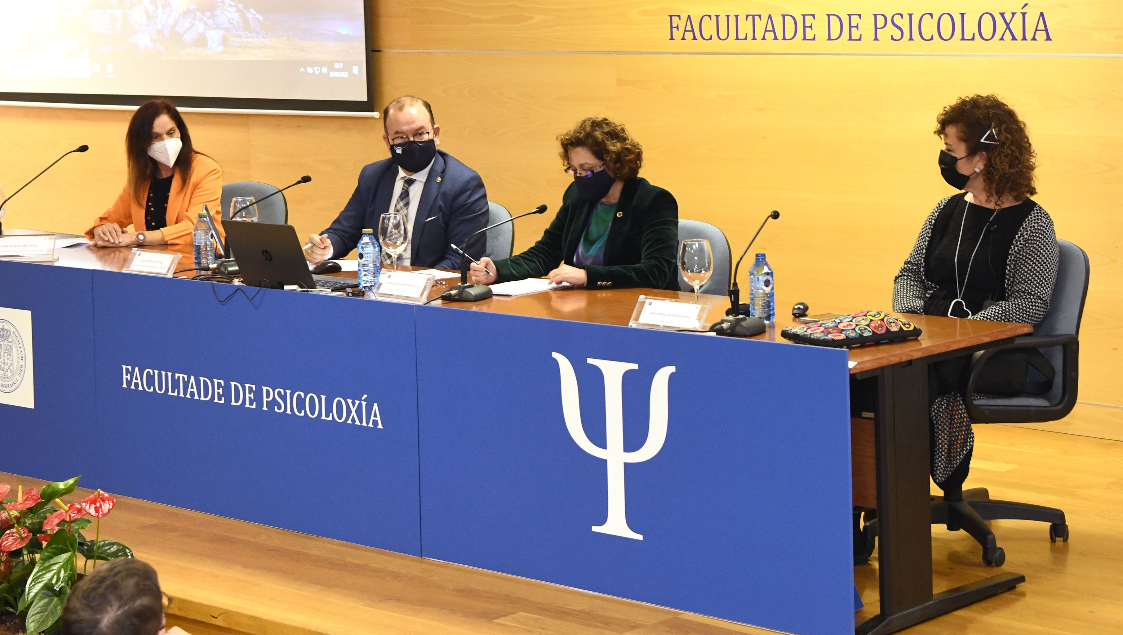 A Facultade de Psicoloxía da USC conmemorou este xoves 24 o Día da Psicoloxía Académica cun acto institucional presidido polo reitor Antonio López e que serviu para profundar na ‘Saúde mental no traballo: unha aproximación dende a Psicoloxía Organizacional Positiva’, a través do relatorio de Marisa Salanova Soria, catedrática de Psicoloxía Social da Universitat Jaume I. No acto, tamén tomaron parte Mª José Sampedro Vizacaya, decana do centro; Rosa Álvarez Prada, decana do Colexio Oficial de Psicoloxía de Galicia; e o catedrático da USC José Manuel Sabucedo Cameselle, quen desenvolveu a presentación da conferenciante.