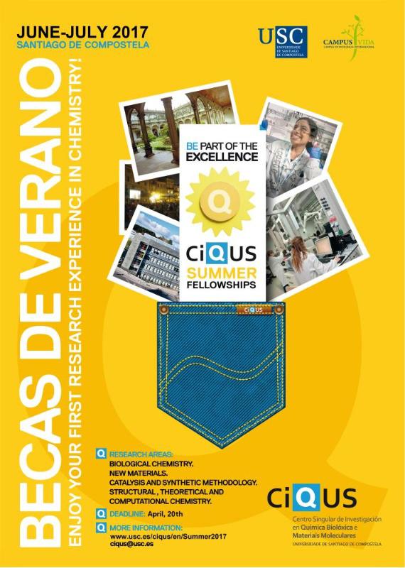A terceira edición do CiQUS Summer Fellowships diríxese a estudantes de grao con experiencia en Química ou estudos relacionados para realizar prácticas formativas de iniciación á investigación da man de equipos científicos de excelencia e nunhas instalacións de primeiro nivel. As persoas seleccionadas recibirán 700 euros ao mes e terán cubertos os gastos de viaxe.