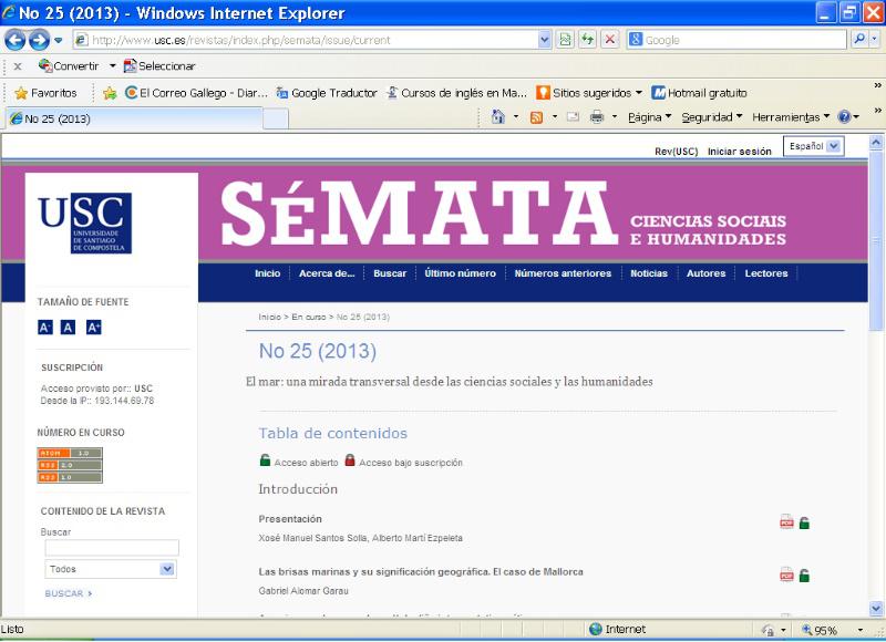 A revista Sémata, de Ciencias Sociais e Humanidade achega na súa última entrega unha visión transversal do mar e das súas manifestacións e actividades asociadas, a través de contribucións e investigacións desenvolvidas por autores pertencentes a diversas universidades de España, Brasil e Chile, nas que se aborda de xeito interdisciplinar a realidade do mar desde a perspectiva das ciencias sociais e das humanidades en relación coa importancia que ten na vida das persoas e, polo tanto, no conxunto da sociedade. O vicerreitor de Estudantes, Cultura e Formación Continúa, Francisco Durán Villa, presentou este martes na Facultade de Xeografía e Historia o número 25 de Sémata co título ‘O mar: unha ollada transversal desde as ciencias sociais ás humanidades’, que coordinan os profesores Alberto Martí Ezpeleta e Xosé Manuel Santos Solla. A directora da revista, editada pola Facultade de Xeografía e Historia da USC, Marta Cendón Fernández; a vicedecana do devandito centro universitario, Pilar Rodríguez, e o director do servizo de publicacións da USC, Juan Blanco, tamén participaron na presentación. O carácter transversal da súa temática e a internacionalización dos seus autores, entre os que se atopan docentes e investigadores da Universidade de Santiago de Compostela, Universitat Illes Balears, Universitat de Barcelona, Universidad de Sevilla, Université de Montréal, Universidad de Los Lagos (Chile), Universidade Federal de Santa María (Río Grande do Sul, Brasil) ou Universidade Federal de Paraíba (Brasil), son dúas características salientables desta nova publicación que vén de saír do prelo. Respecto das áreas estudadas nesta última entrega, a revista Sémata aborda o tema da pesca nas súas diversas manifestacións: a artesanal, a acuicultura, a internacionalización das flotas europeas ou a pesca desde unha perspectiva de xénero, en diversos escenarios: galicia, Brasil, Chile... Cunha visión do proceso histórico, outros autores afrontan nesta nova publicación a análise da importancia dos bancos de bacallau de Terranova nos séculos XVI e XVIII ou achegan ao lector/a á pesqueira tradicional da almadraba propia do sur da Península Ibérica.