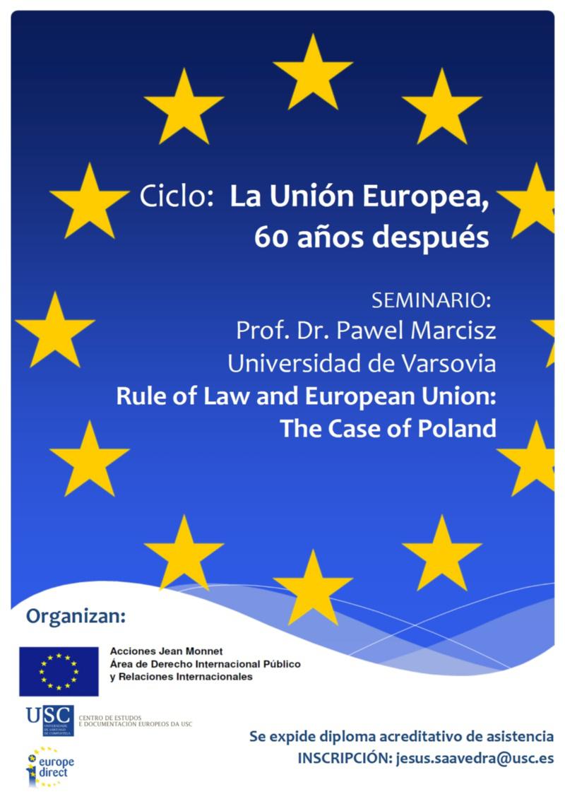 O Centro de Estudos e Documentación Europeos da USC (CEDE) co organiza este martes 6 e o mércores 7 o seminario ‘Rule of Law and European Unión: the case of Poland’, a cargo do profesor do Instituto de Dereito Internacional da Universidade de Varsovia Pawel Marcisz. O seminario é parte do ciclo ‘A Unión Europea 60 anos despois’ encadrado nas Accións Jean Monnet da Área de Dereito Internacional Público e Relacións Internacionais da Facultade de Dereito da USC.