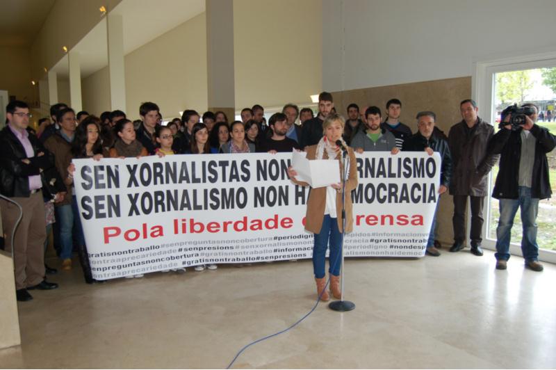 ‘Sen xornalistas non hai xornalismo. Sen xornalismo non hai democracia. Pola liberdade de prensa’ é o lema da xornada que se desenvolveu na Facultade de Ciencias da Comunicación da Universidade de Santiago con motivo da conmemoración o 3 de maio como día da Liberdade de Expresión. Promovido polo propio centro universitario e a Asociación de Xornalistas de Santiago de Compostela como integrante da Federación de Asociacións de Periodistas de España (FAPE), o acto central desta xornada foi a lectura dun manifesto no q se realizou un “chamamento aos poderes e institucións públicas e á sociedade en xeral para que defendan e promovan a liberdade de prensa, como garantía imprescindible da democracia”. A lectura do manifesto serviu para poñer de relevo a confluencia do momento actual cunha “ grave crise do sector xornalístico”, traducido na perda de 6.000 empregos nos últimos catro anos, “ o peche de decenas de medios, o aumento do intrusismo, a precariedade laboral xeralizada e o acoso dos poderes ao traballo xornalístico”. Ante a presenza dun nutrido grupo de futuros profesionais, o manifesto vincula o fortalecemento da defensa da liberdade de expresión ao “exercicio responsable do xornalismo polos xornalistas e editores, baseado no estrito cumprimento das normas éticas e deontolóxicas e en valores como a integridade e o rigor profesional”. Xornada lúdica Con anterioridade a esta lectura, estudantes de primeiro curso de Comunicación Audiovisual presentarán os seus traballos nunha sesión no Auditorio da Facultade. Ademais, no acceso ao centro, desenvolveuse un concerto de Efecto Pygmalion. A xornada complétase coa celebración a partir das 16.30 horas da festa XorCav, organizada por estudantes de terceiro de Xornalismo e de Comunicación Audiovisual e na que desenvolven diversas competicións de videoxogos, unha gala onde se amosan os traballos de estudantes e unha festa con grupos musicais de estudantes.