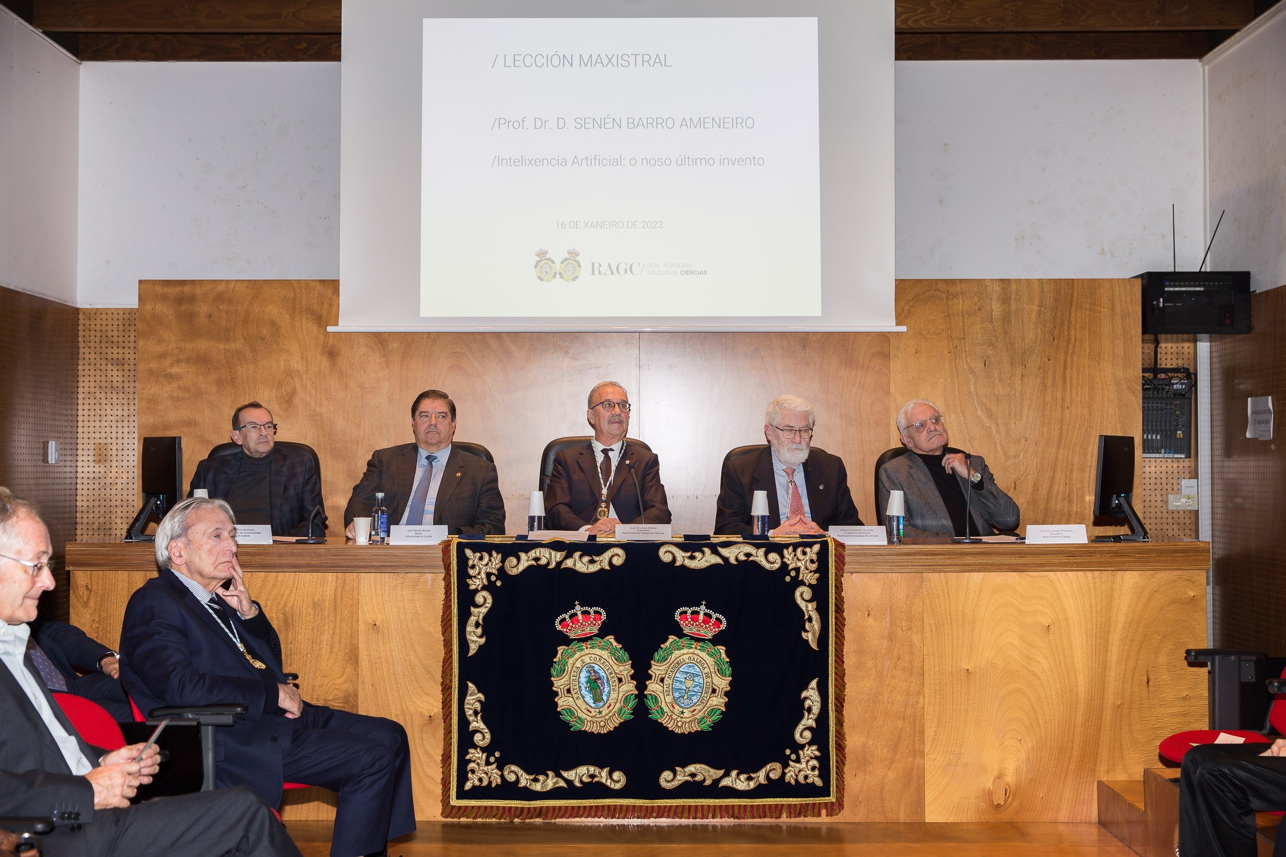 O catedrático da USC e académico numerario da Sección de Ciencias Técnicas da Real Academia Galega de Ciencias (RAGC), Senén Barro, impartiu este luns a lección maxistral titulada ‘Intelixencia Artificial: o noso último invento’ no acto de apertura do curso académico 2023 desta institución. Na sesión que tivo lugar no Pazo de San Roque, o tamén director científico do Centro Singular de Investigación en Tecnoloxías Intelixentes da USC (CITIUS) salientou que “a intelixencia artificial é un dos campos científico-tecnolóxicos máis activos e cun maior impacto social e económico na actualidade”. O acto estivo presidido polo profesor emérito da USC e presidente da RAGC, Juan Lema, e contou coa presenza do vicerreitor de Política Científica da USC, Vicente Pérez Muñuzuri.