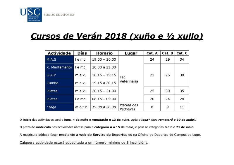 A Aula de Deporte e Cultura da Facultade de Veterinaria acollerá actividades de ximnasia de mantemento, mantemento+aerobic+step, G.A.P (ximnasia que fortalece glúteos, abdominais e pernas), zumba e pilates entre o 4 de xuño e o 13 de xullo. As clases de ioga, pola súa parte, celebraranse no ximnasio da piscina das Pedreiras e rematarán o 30 de xuño. Os horarios poden consultarse na páxina do Servizo de Deportes.