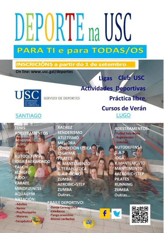 A oferta de actividades e escolas deportivas do Servizo de Deportes da USC para o curso 2017-2018 xa se pode consultar na web da USC, onde tamén se pode visualizar o calendario da programación xa deseñada, que podería ser susceptible dalgún tipo de variación en función da demanda rexistrada.