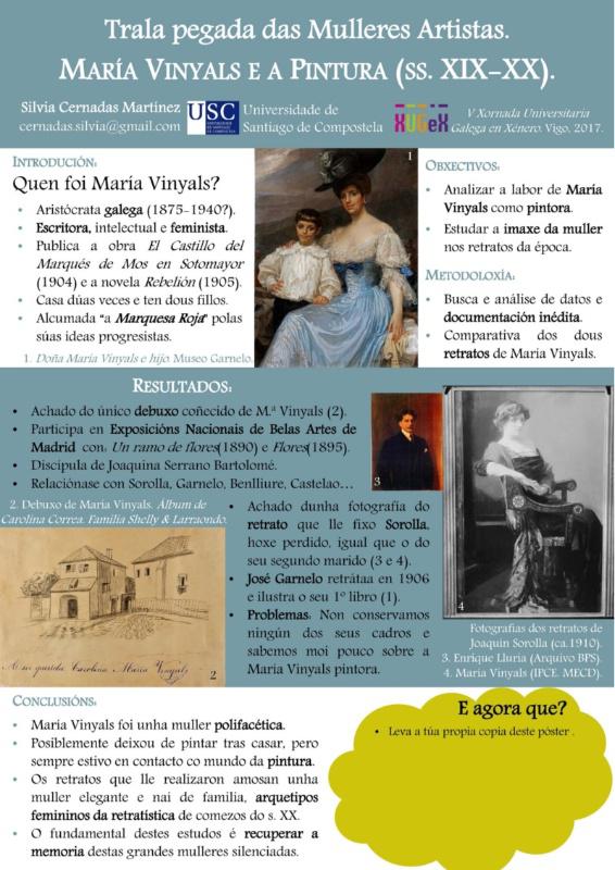O traballo de Silvia Cernadas, elixido entre os 24 presentados, versa sobre a escritora e feminista galega María Vinyals (1875-1940?), da que non existen moitas investigacións. En concreto, Cernadas centrou o póster na faceta menos coñecida da obra de Vinyals, a partir das achegas de varios materiais inéditos. Por un lado, a súa labor como pintora e debuxante e, por outro, a imaxe das mulleres nos retratos de comezos do século XX.