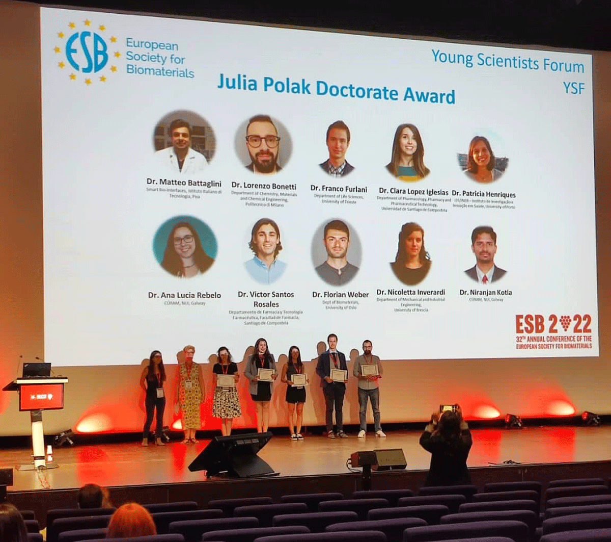 Os investigadores Clara López Iglesias e Víctor Santos Rosales recibiron o Julia Polak Doctorate Award no transcurso do 32º Congreso Anual da Sociedade Europea de Biomateriais celebrado en Burdeos, Francia. Estes premios distinguen teses de doutoramento que amosan resultados de alto nivel no eido dos materiais e da enxeñaría de tecidos e que teñan dado lugar a resultados de alto impacto. Ambos traballos foron realizados baixo a dirección dos profesores Carlos A. García González e Carmen Alvarez Lorenzo, do grupo I+D Farma da USC.
