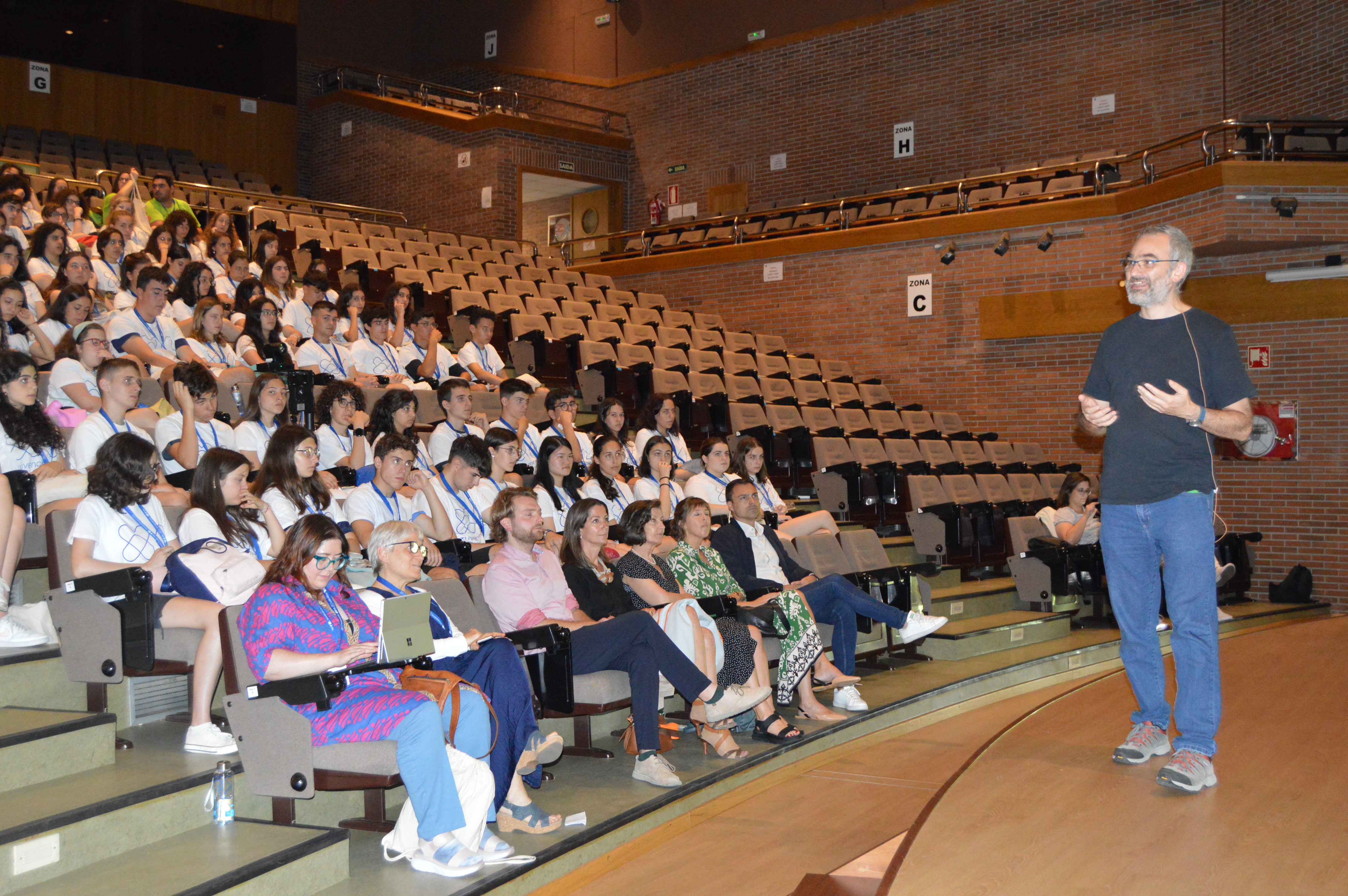 O divulgador científico Manuel Vicente salienta a “capacidade hipnótica da ciencia” na apertura do XI Campus de Verán XuvenCiencia, un programa de convivencia e experimentación científica que ofrece a 95 estudantes de ensino secundario, Bacharelato e Formación Profesional a posibilidade de achegarse durante unha semana de xeito divertido á I+D a través de 16 obradoiros e múltiples actividades de lecer