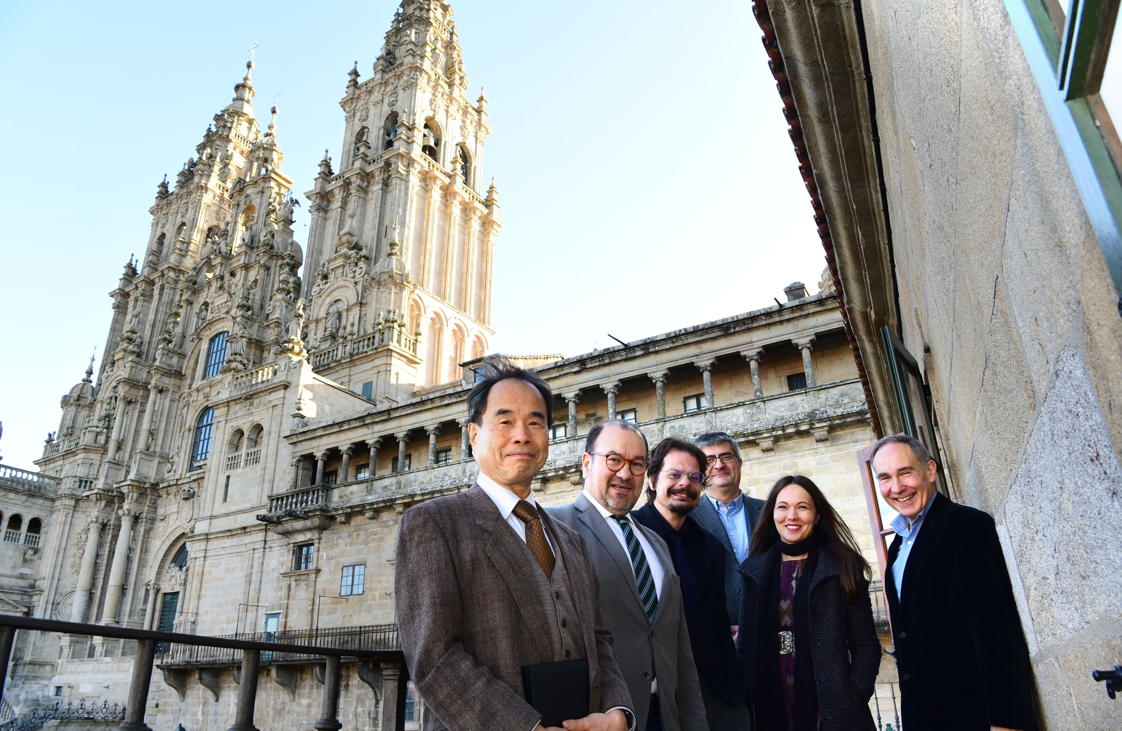 De esquerda a dereita, o profesor Nakada, Antonio López, Diego Martínez, Vicente Pérez, Veronika Chobanova e Bernardo Adeva, na Praza do Obradoiro. FOTO: Santi Alvite