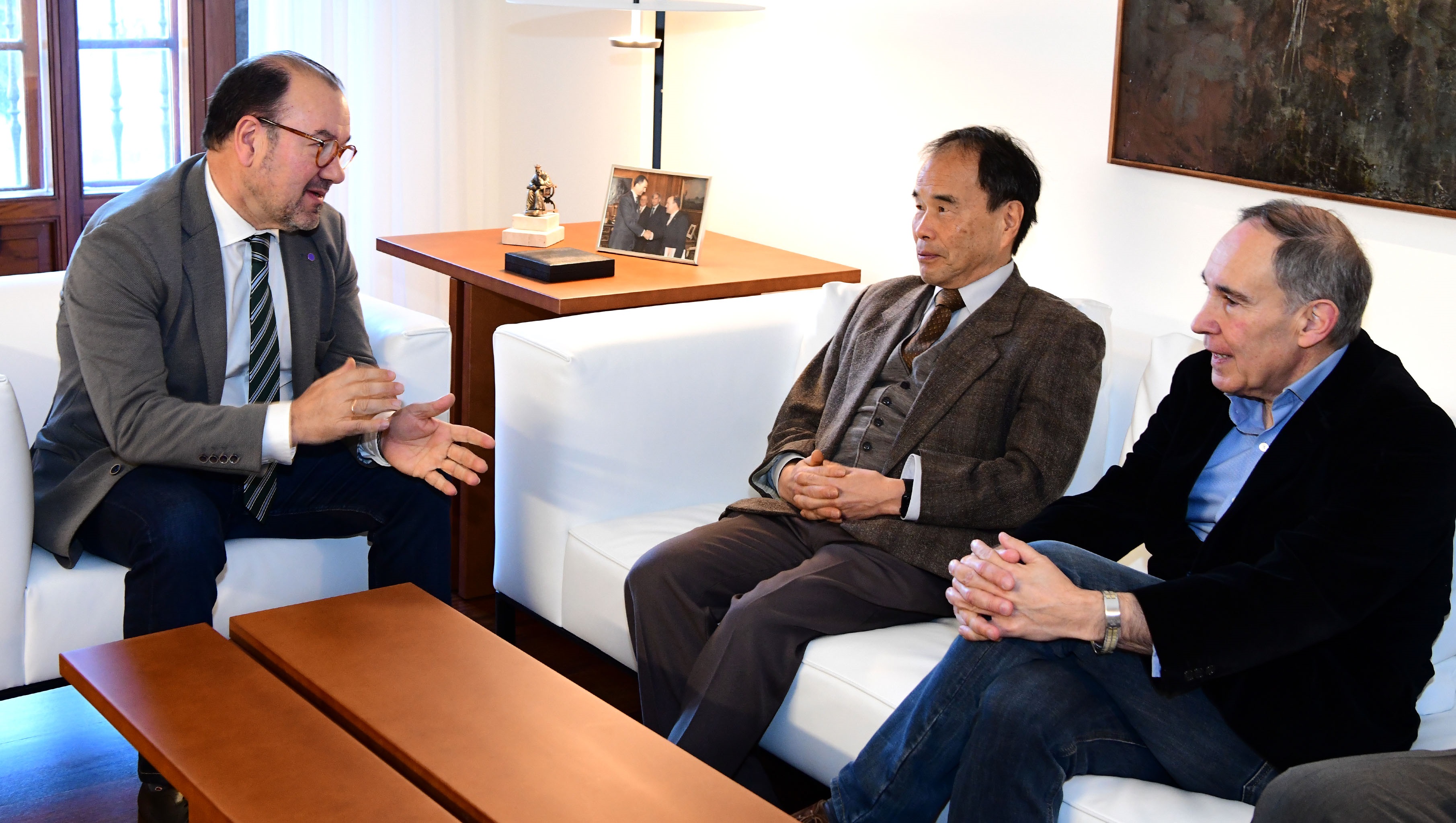 O profesor da Universidade suíza de Lausanne e un dos maiores expertos en experimentos de física de partículas do mundo, Tatsuya Nakada, visitou este luns a USC, onde asinou no Libro de Honra da institución logo de ser recibido, no Colexio San Xerome, polo reitor Antonio López. O profesor Nakada estivo acompañado polo vicerreitor de Política Científica, Vicente Pérez Muñuzuri, e polos investigadores do Instituto Galego de Física de Altas Enerxías (IGFAE), Bernardo Adeva e Diego Martínez. O IGFAE, centro mixto da USC e da Xunta de Galicia, convidou a Tatsuya Nakada a Compostela con motivo da defensa da tese do investigador predoutoral do IGFAE, Marcos Romero Lamas.