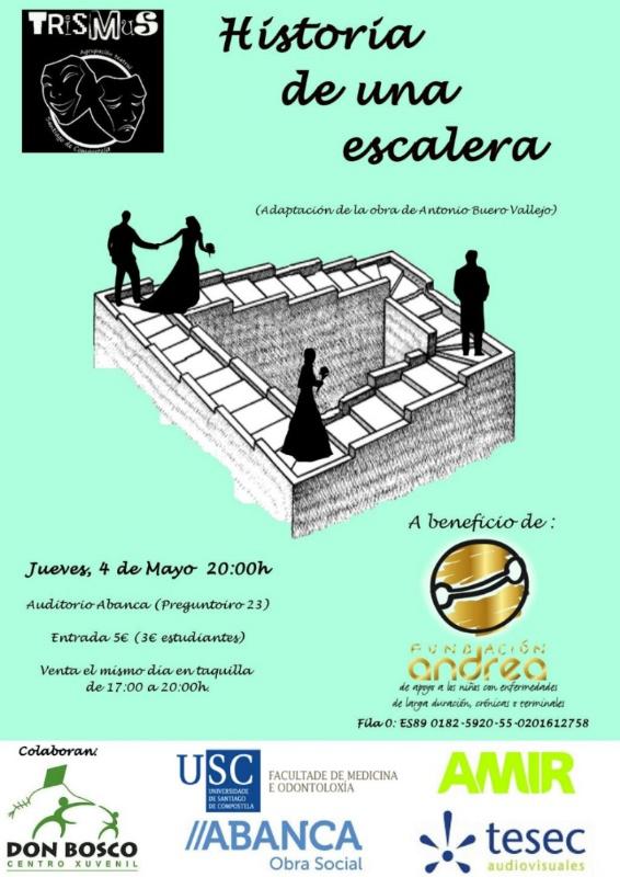 Nesta ocasión representarán ás 20.30 horas no teatro Abanca (rúa Preguntoiro, 23) unha adaptación da obra ‘Historia de una escalera’ de Antonio Buero-Vallejo. A entrada é de 3 euros para estudantes e 5 para o público xeral e o recadado irá integramente á fundación. A venda dos billetes será o propio xoves de 17.00 a 20.00 horas.