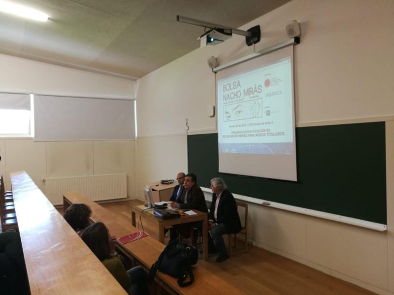 A Facultade de Ciencias da Comunicación acolleu este xoves a presentación da terceira edición da bolsa ‘Nacho Mirás’ para novos titulados, organizada e desenvolvida polo Colexio Profesional de Xornalistas de Galicia e patrocinada por Abanca coa colaboración da propia Facultade. A bolsa supón unha achega de 6.000 euros destinados a proxectos xornalísticos de novos/as titulados/as en Xornalismo ou Comunicación Audiovisual.