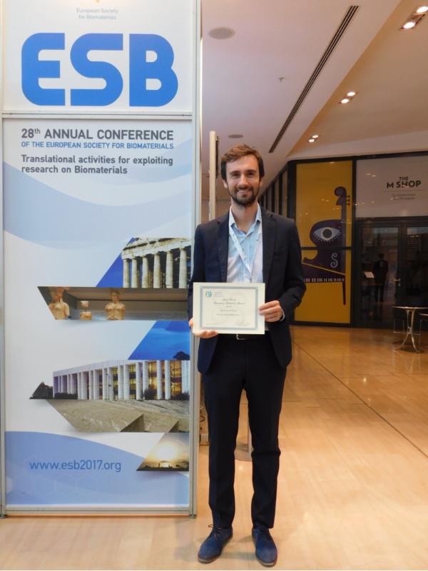 O investigador do grupo de I+D Farma Luis Antonio Díaz Gómez acaba de recoller o Julia Polak European Doctorate Award no transcurso do congreso anual da Sociedade Europea de Biomateriais celebrado en Atenas. Este recoñecemento premia aquelas teses de doutoramento que acreditan un alto nivel de formación do investigador nos campo dos biomateriais e a enxeñaría de tecidos e que teñan dado lugar a resultados científicos publicados en revistas de elevado índice de impacto.