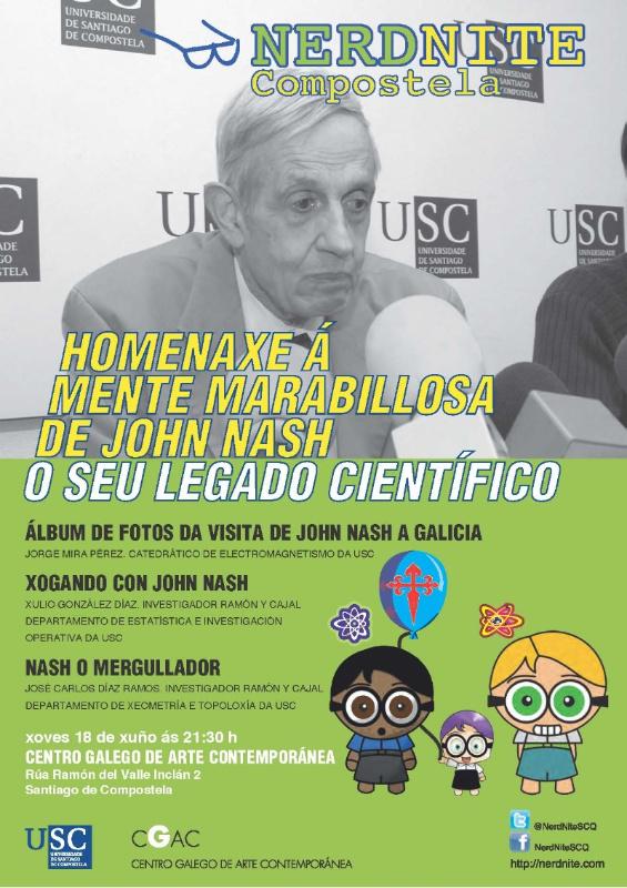 Cun percorrido fotográfico polo paso por Santiago en 1997 do Premio Nobel John Nash –r ecentemente finado nun accidente de tráfico– comezará o catedrático de Electromagnetismo da USC Jorge Mira a última NerdNite do curso este xoves 18. A partir das 21.30 horas no Centro Galego de Arte Contemporánea o profesor Mira, responsable do programa ConCiencia que trouxo a Compostela ao prestixioso científico, mostrará con fotografías as diversas actividades nas que participou Nash acompañado da súa familia. Seguiralle o investigador Ramón y Cajal do Departamento de Estatística e Investigación Operativa da USC Xulio González Díaz coa charla ‘Xogando con John Nash’, en alusión á achega que o Premio Nobel fixo á Teoría de Xogos ao descubrir o chamado equilibrio de Nash. Por último intervirá o investigador Ramón y Cajal do Departamento de Xeometría e Topoloxía da USC José Carlos Díaz Ramos con ‘Nash o mergullador’.