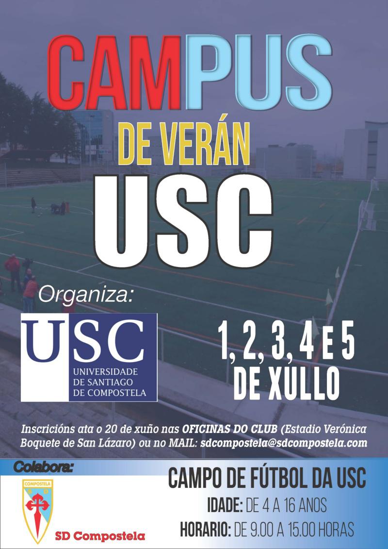 Rapaces e rapazas de 4 aos 16 anos son os destinatarios do Campus de Verán de fútbol que organiza a USC coa colaboración da SD Compostela a comezos do vindeiro mes de xullo. A inscrición pode formalizar nas oficinas do club compostelán no Estadio Vero Boquete de San Lázaro ou a través do correo electrónico sdcompostela [at] sdcompostela.com (sdcompostela[at]sdcompostela[dot]com) ata o próximo xoves 20 de xuño. O Campus desenvolverase entre os días 1 e 5 de xullo no campo da USC, en horario de 9.00 a 15.00 horas. A cota xeral de participación será de 90 euros, con descontos para familiares da comunidade universitaria, canteira da SD Compostela e irmáns ou irmás de inscritos.