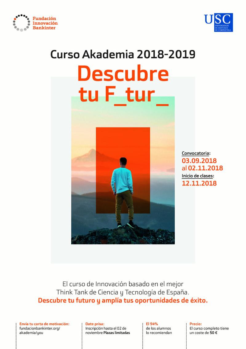 Ata o próximo 2 de novembro permanecerá aberto o prazo de inscrición para participar no curso de innovación Akademia na USC, organizado pola Fundación da Innovación Bankinter en colaboración coa Universidade de Santiago de Compostela e Uninova. En Akademia o alumnado coñecerá as tendencias de innovación que xerarán valor no futuro inmediato. Durante o curso 2018-2019 e a partir dun material e unha metodoloxía diferentes, aprenderase unha nova forma de afrontar retos, traballar en equipo e desenvolver un proxecto innovador.