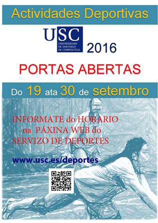 Ata o próximo día 30, as persoas interesadas dispoñen dos últimos días para participar de balde e probar as distintas escolas deportivas da USC –agás tenis e piscina- en Santiago e Lugo a través das xornadas de portas abertas que organiza o Servizo de Deportes. No caso de grupo nos que o aforo estea completo, poderase observar o desenvolvemento da sesión e facer as consultas que se consideren oportunas.