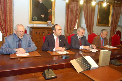 De esquerda a dereita: o profesor Luis Iglesias Feijoo, o reitor Senén Barro Ameneiro, o director literario da Biblioteca Castro, Darío Villanueva Prieto; e o profesor Don Cruickshank