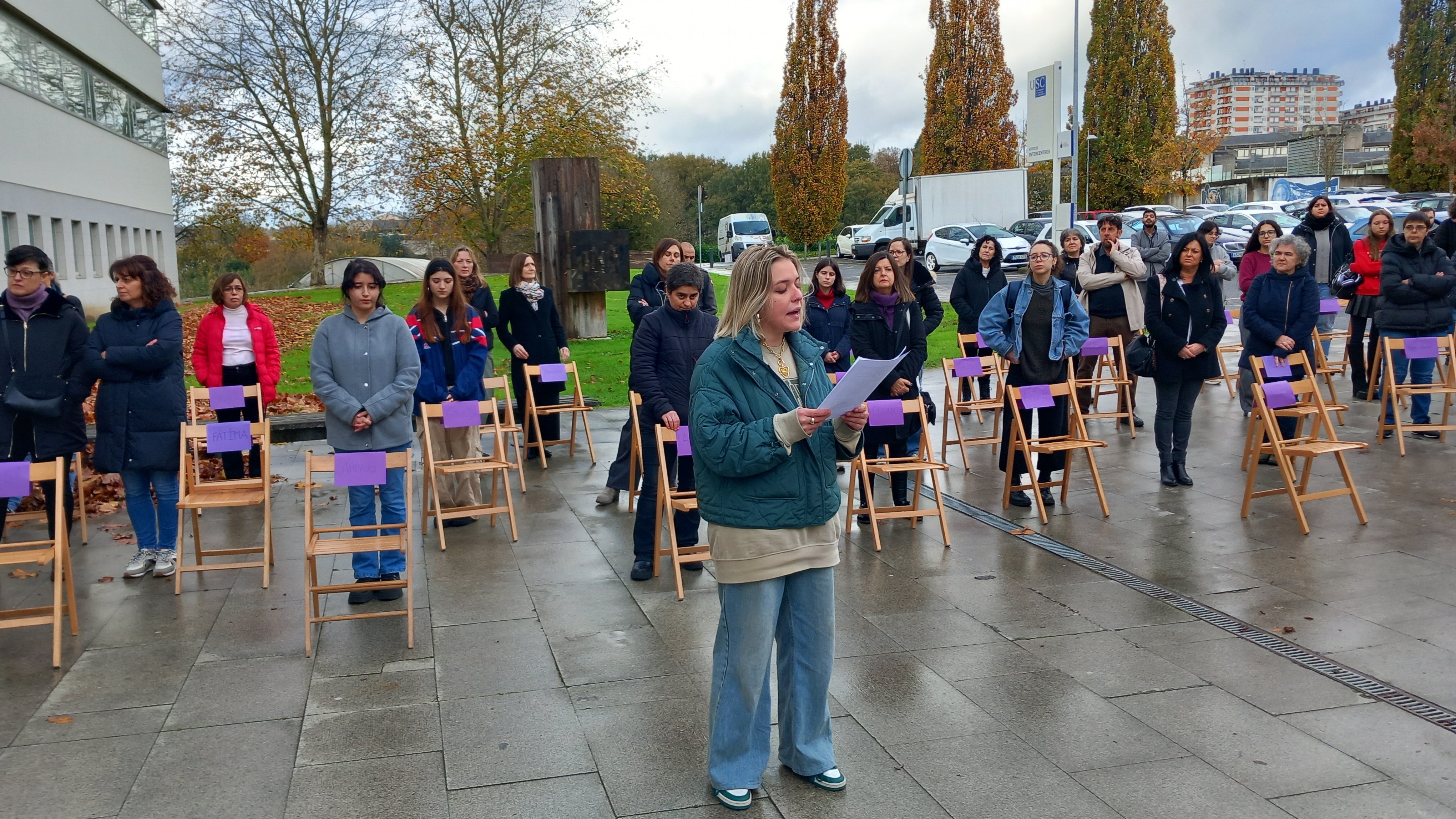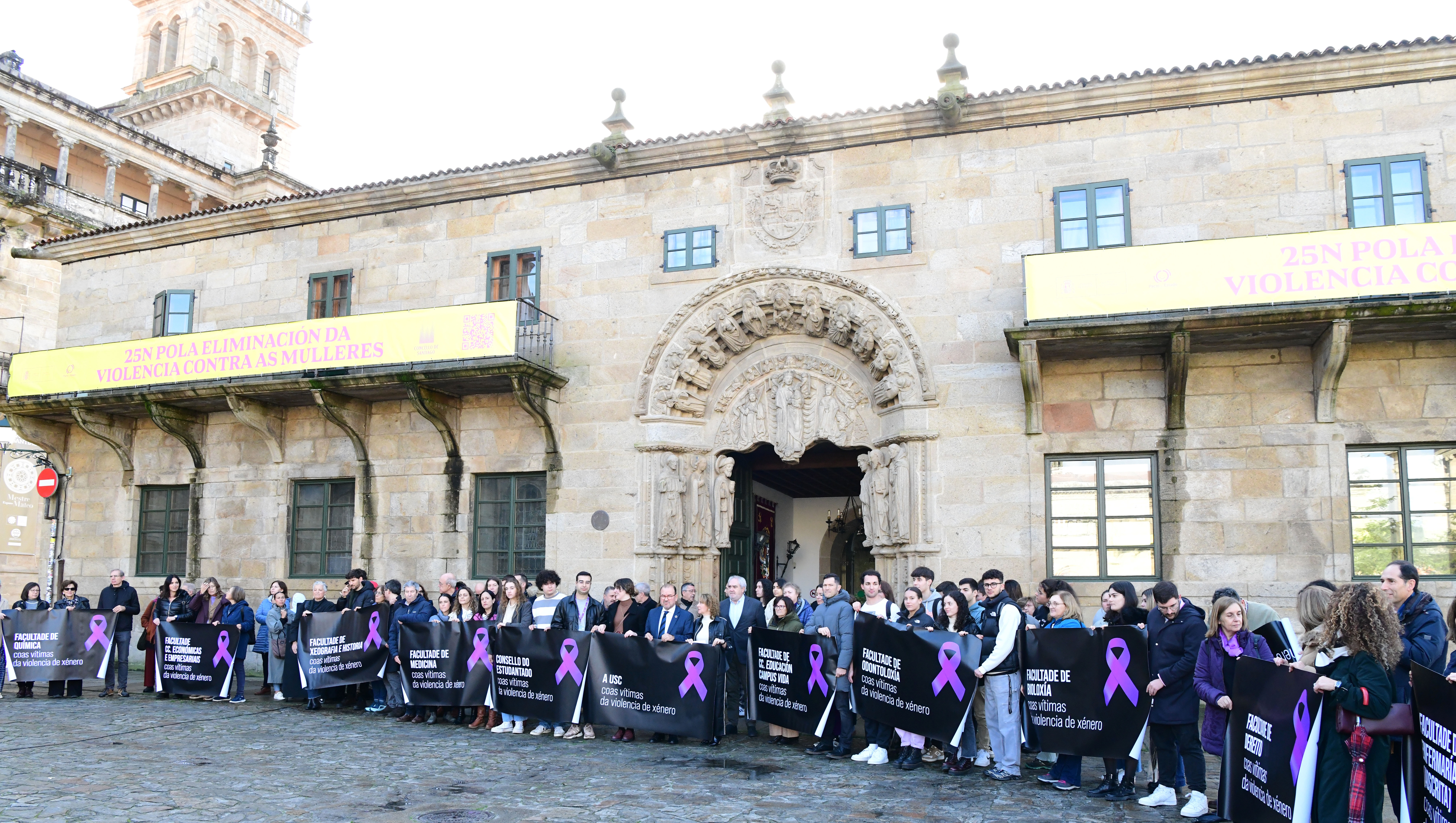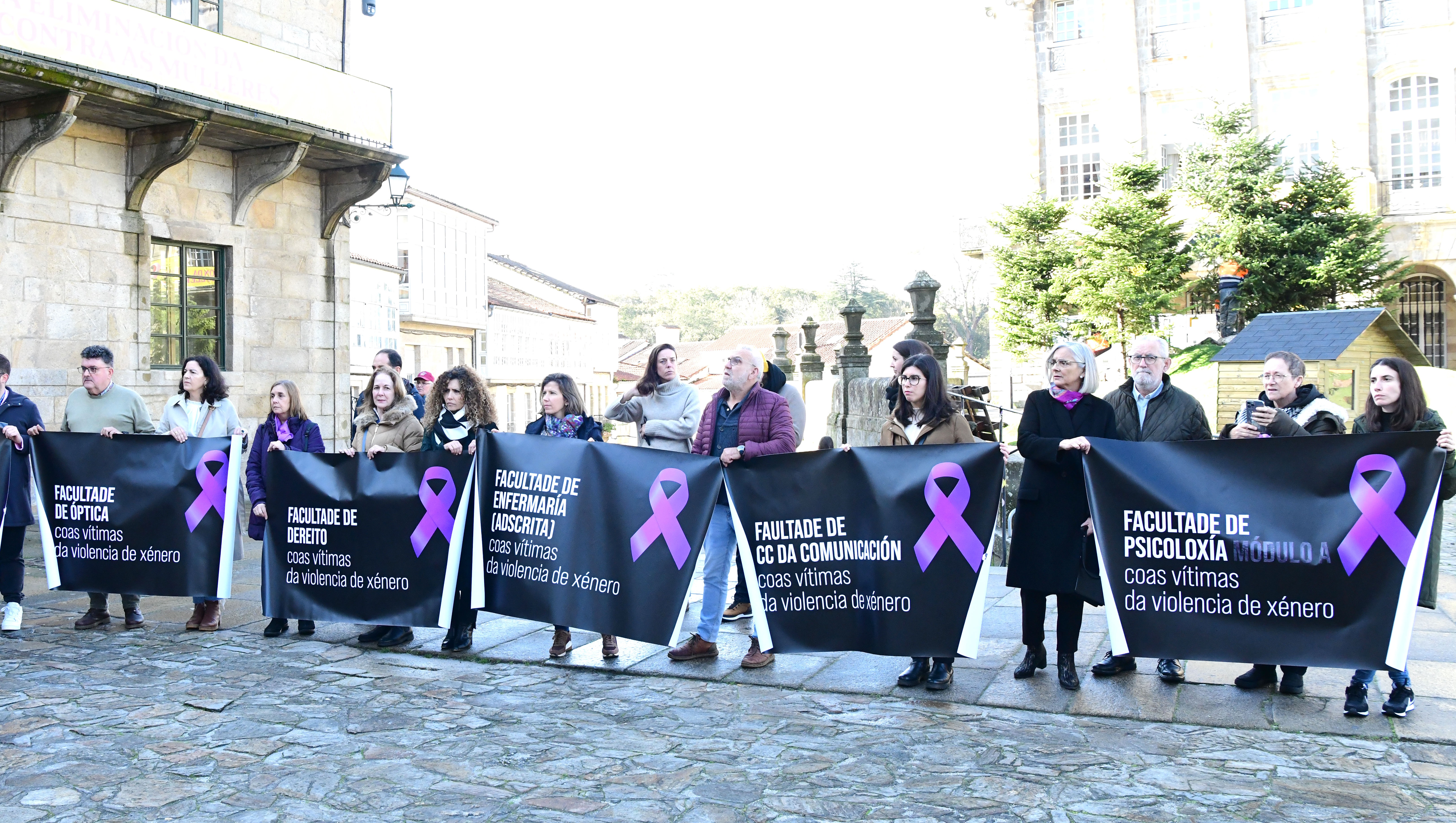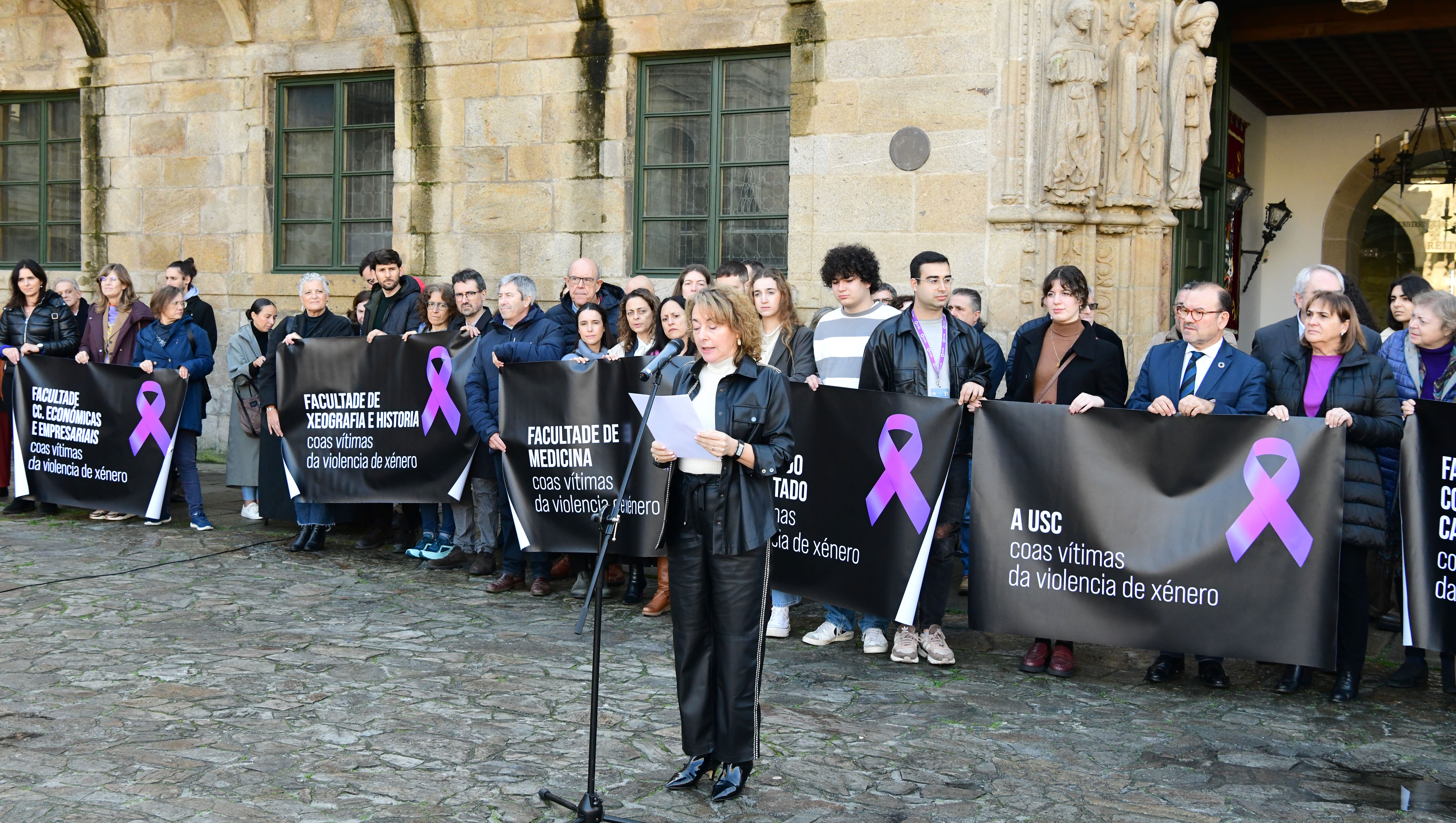 Representantes do equipo de goberno, da comunidade universitaria dos centros docentes e do Consello do Estudantado da USC gardaron hoxe un minuto de silencio en recordo das vítimas de violencia de xénero e en rexeitamento da violencia contra as mulleres neste 25N. O acto en Santiago tivo lugar na Praza do Obradoiro coa presenza do reitor Antonio López e parte do equipo reitoral, mentres que en Lugo foi no Edificio Intercentros coa participación do vicerreitor de Organización Académica e Campus de Lugo, Francisco Fraga, e da delegada do reitor para a Igualdade, Sonia Esperanza Rodríguez Boente.