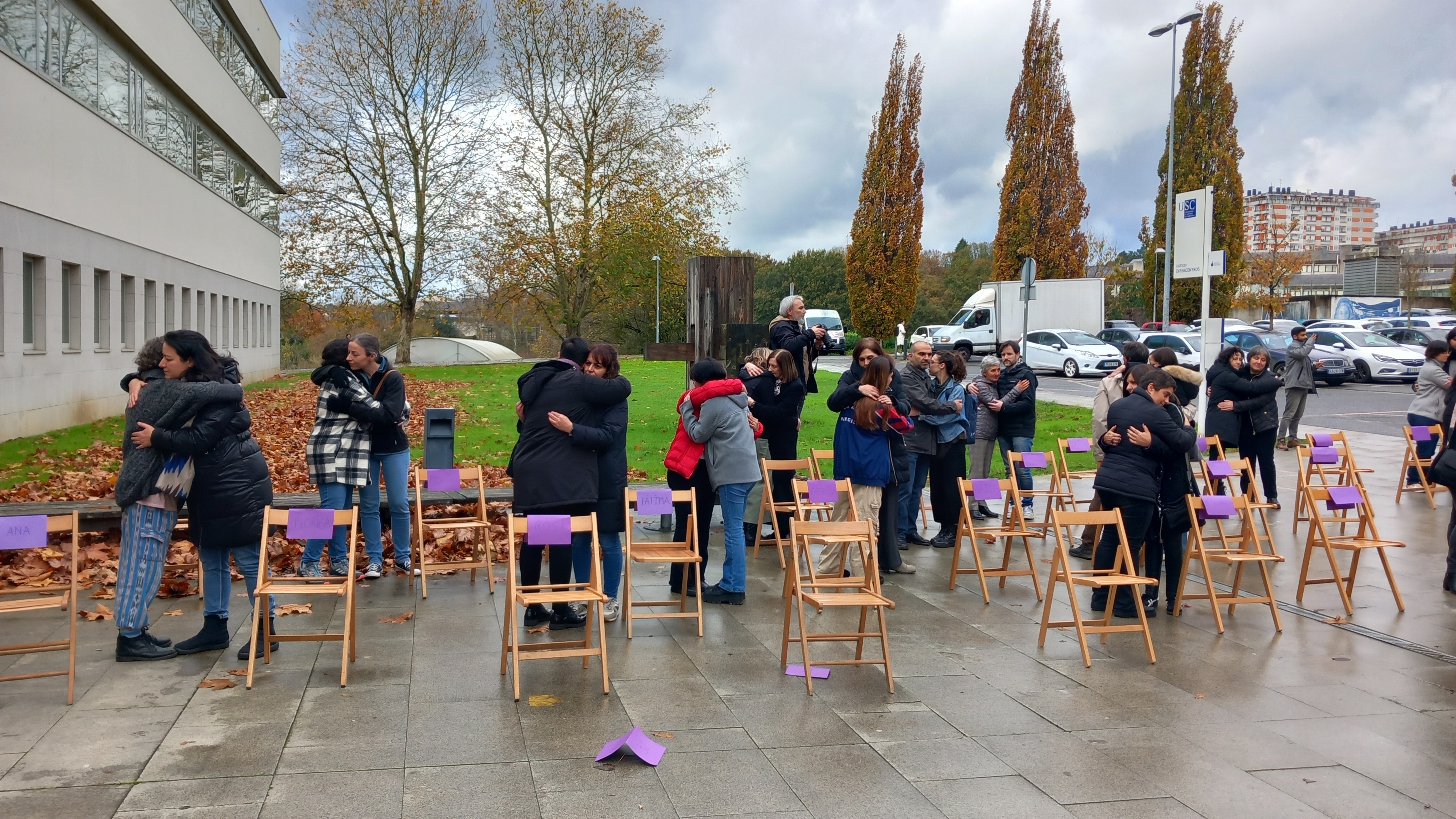 A xornada reivindicativa completouse con dúas actividades de carácter cultural. Baixo o lema ‘Non son cifras, son persoas’ a comunidade universitaria do Campus de Lugo participou nunha performance, organizada polas comisións de Igualdade do Campus, na que simbolicamente 42 cadeiras representaban cada unha das vítimas coas que se cebou, no que vai de ano, a violencia machista. Á pronuncia do nome de cada muller asasinada, seguíalle a lectura de datos relativos á súa vida coa intención de construír un relato colectivo deste tipo de violencia.