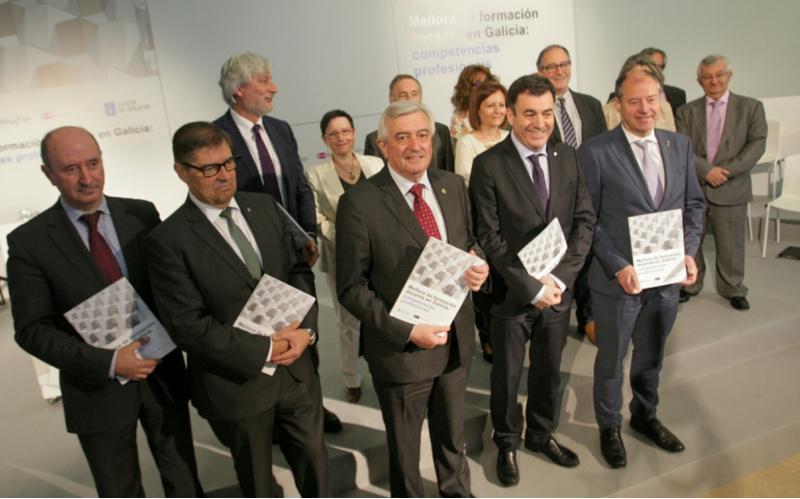 O reitor Juan Viaño asistiu este venres xunto aos seus homólogos da Coruña e Vigo, Julio Abalde e Salustiano Mato, e o conselleiro Román Rodríguez á presentación do documento de mellora da formación docente en Galicia, un traballo pioneiro en toda o Estado, segundo a administración autonómica. É un documento de conclusións do grupo de traballo constituído con representantes das facultades de Ciencias da Educación das tres universidades galegas xunto con representantes da Consellaría de Cultura, Educación e Ordenación Universitaria para analizar as competencias profesionais docentes en Galicia e reflexionar sobre as que o estudantado de Maxisterio deberían adquirir na carreira. Da USC integraron este grupo de traballo a profesora Carmen Fernández Morante e Francisco Rodríguez Lestegás.