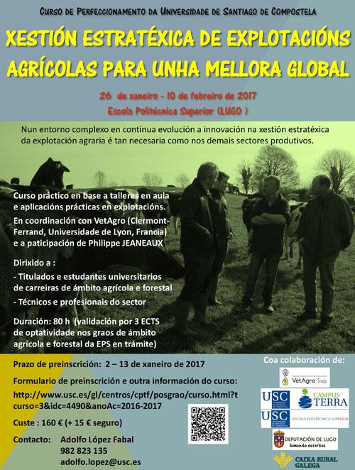 Para contribuír a unha mellora neste campo, o Departamento de Produción Vexetal e Proxectos de Enxeñaría da USC e a escola VetAgro Sup da Universidade francesa de Lyon organizan o curso de perfeccionamento Xestión estratéxica de explotacións agrícolas para unha mellora global continua, que se vai desenvolver entre o 26 de xaneiro e o 10 de febreiro na Escola Politécnica Superior de Lugo coa colaboración do Campus Terra e da Caixa Rural Galega. A preinscrición está aberta ata este venres 13.