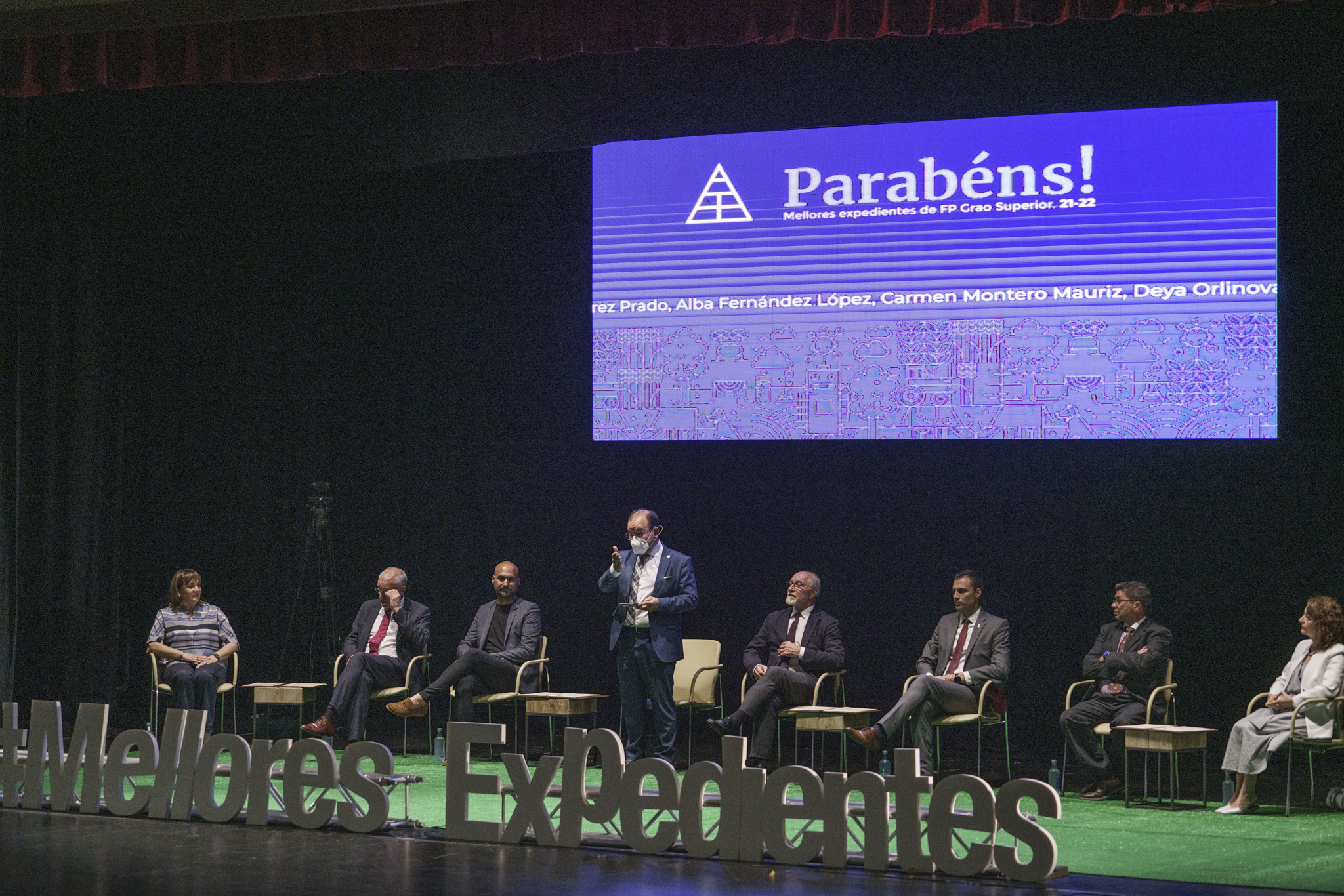 O delegado do reitor da USC para Ensino Medio, Celso Rodríguez; o director do centro público integrado de Formación Profesional As Mercedes, Joaquín Expósito López, e a alumnado do centro de formación e experimentación agroforestal de Sergude Anyela Roca Paz, que falou en representación do alumnado galardoado, completaron a quenda de relatores que tomaron parte na sesión.