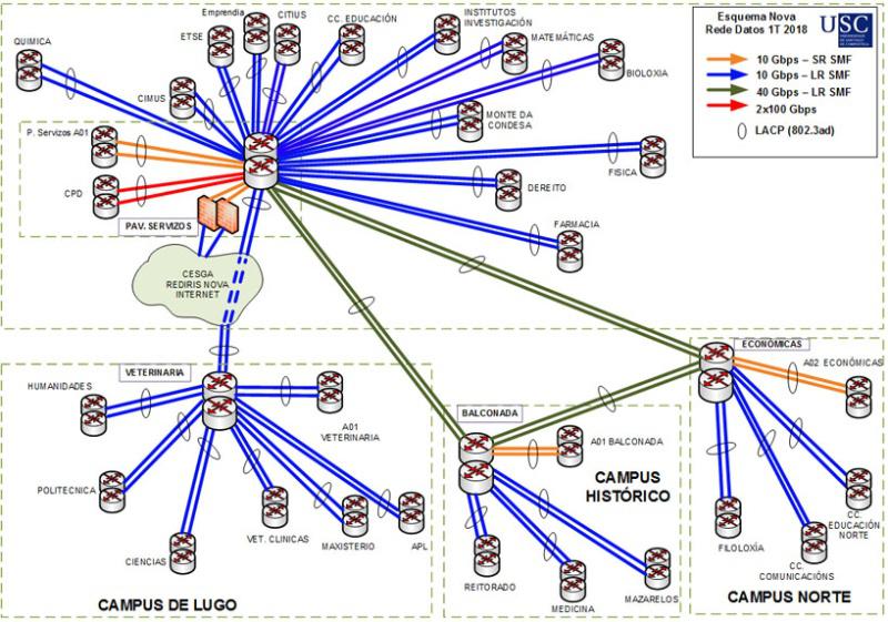 A Universidade de Santiago acaba de actualizar a súa rede de datos para os vindeiros dez anos, mellorando así en velocidades, estabilidade, redundancia e capacidade de novos servizos de seguridade, análise e monitorización.
