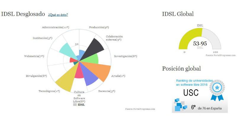 A Universidade de Santiago é a sexta das 76 universidades españolas avaliadas polo seu compromiso na difusión do software libre (SL). Así se desprende do Ránking de Universidades en Software Libre (RuSL) na súa edición de 2016. A comparativa realízase en base ao indicador IDSL, no que a USC alcanza 53,95% fronte aos 34,45 de 2015, edición respecto da que mellora dúas posicións.