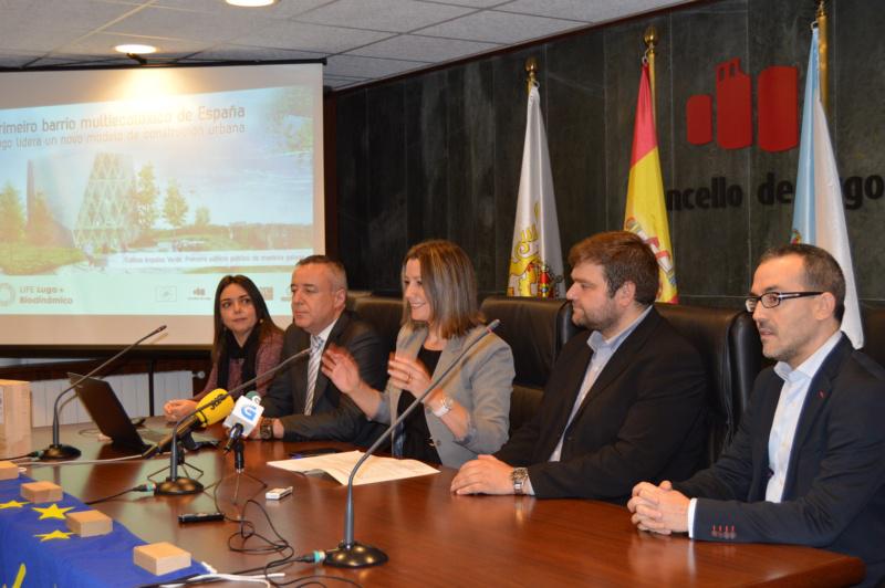 O acto de presentación do proxecto do edificio Impulsa Verde serviu asemade para avanzar algunhas das singularidades previstas no futuro barrio multiecolóxico de Lugo, unha zona na que, ademais de edificios con madeira como elemento estrutural de construción, aplicaranse as solucións de deseño urbano recollidas no que será o primeiro catálogo en Europa de medidas para a adaptación ao cambio climático que se está a elaborar, tamén dentro do Life Lugo+Biodinámico.